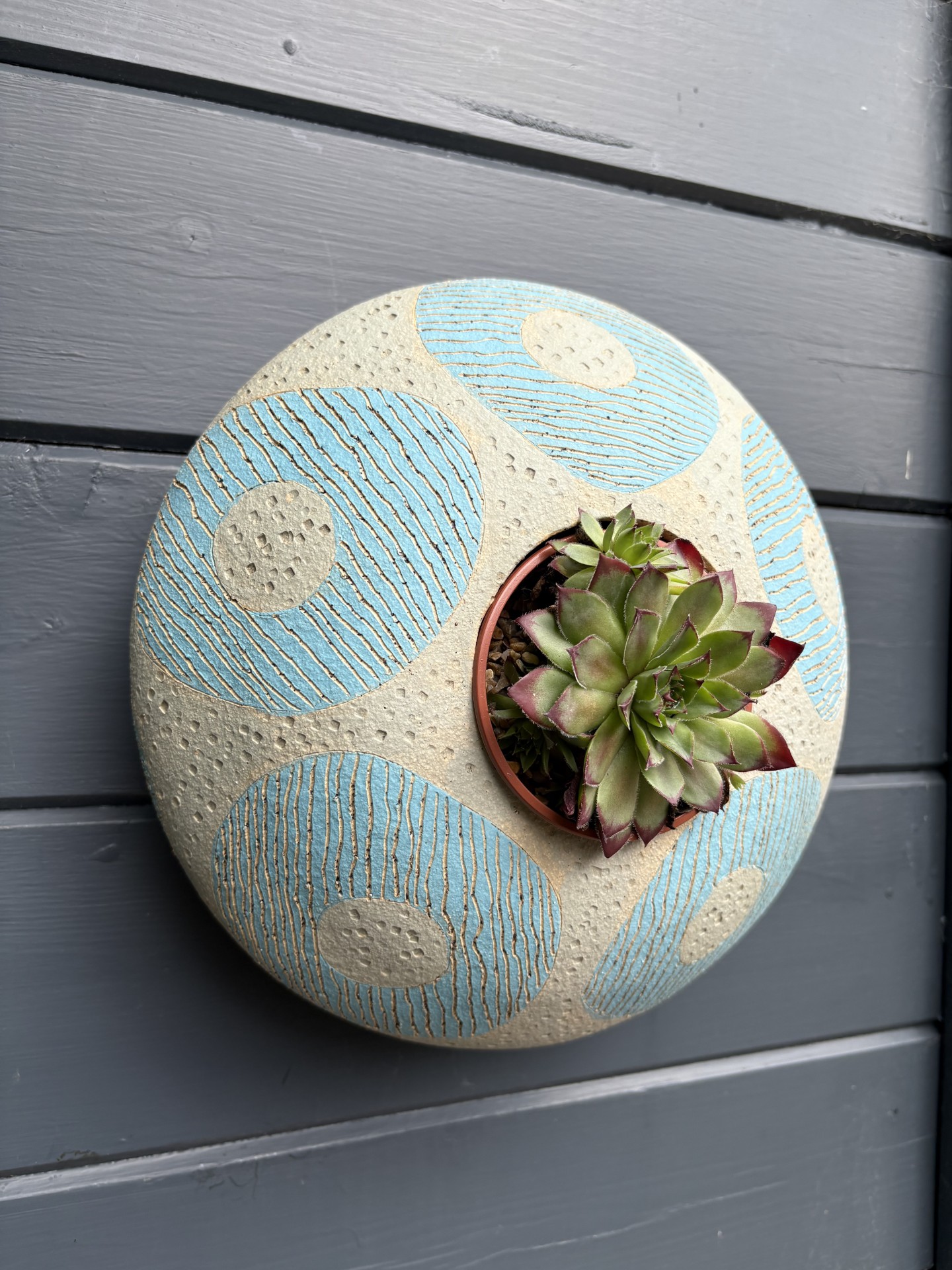SGV286 -Round Pod – Misty Blue – 28cm diameter Drainage holes for planting Keyhole for wall mounting