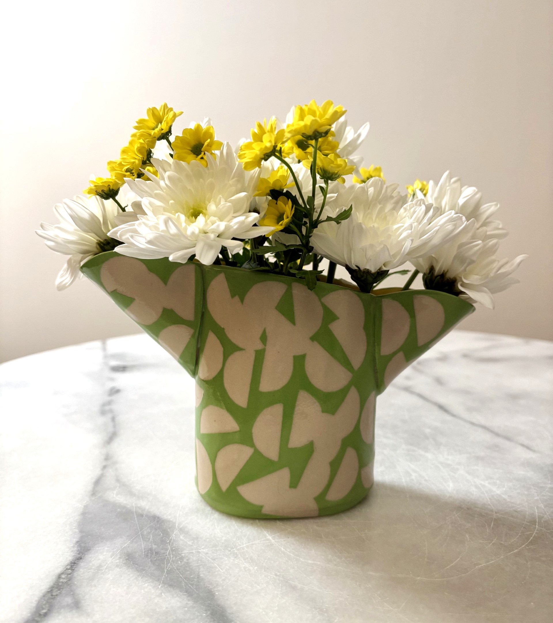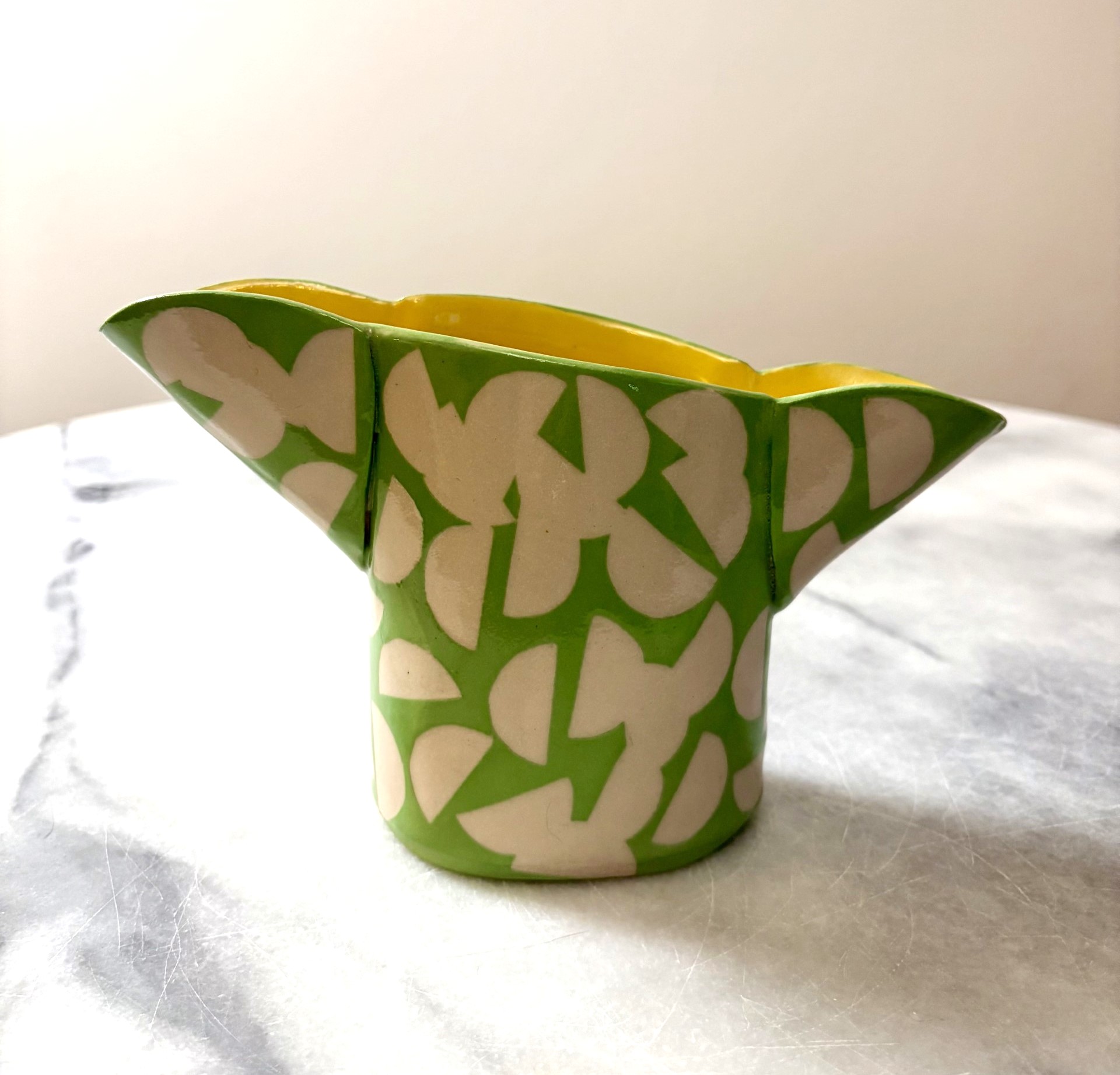 SHC122 -Small double spouted vase -green with yellow interior 12cm tall x 11cm wide