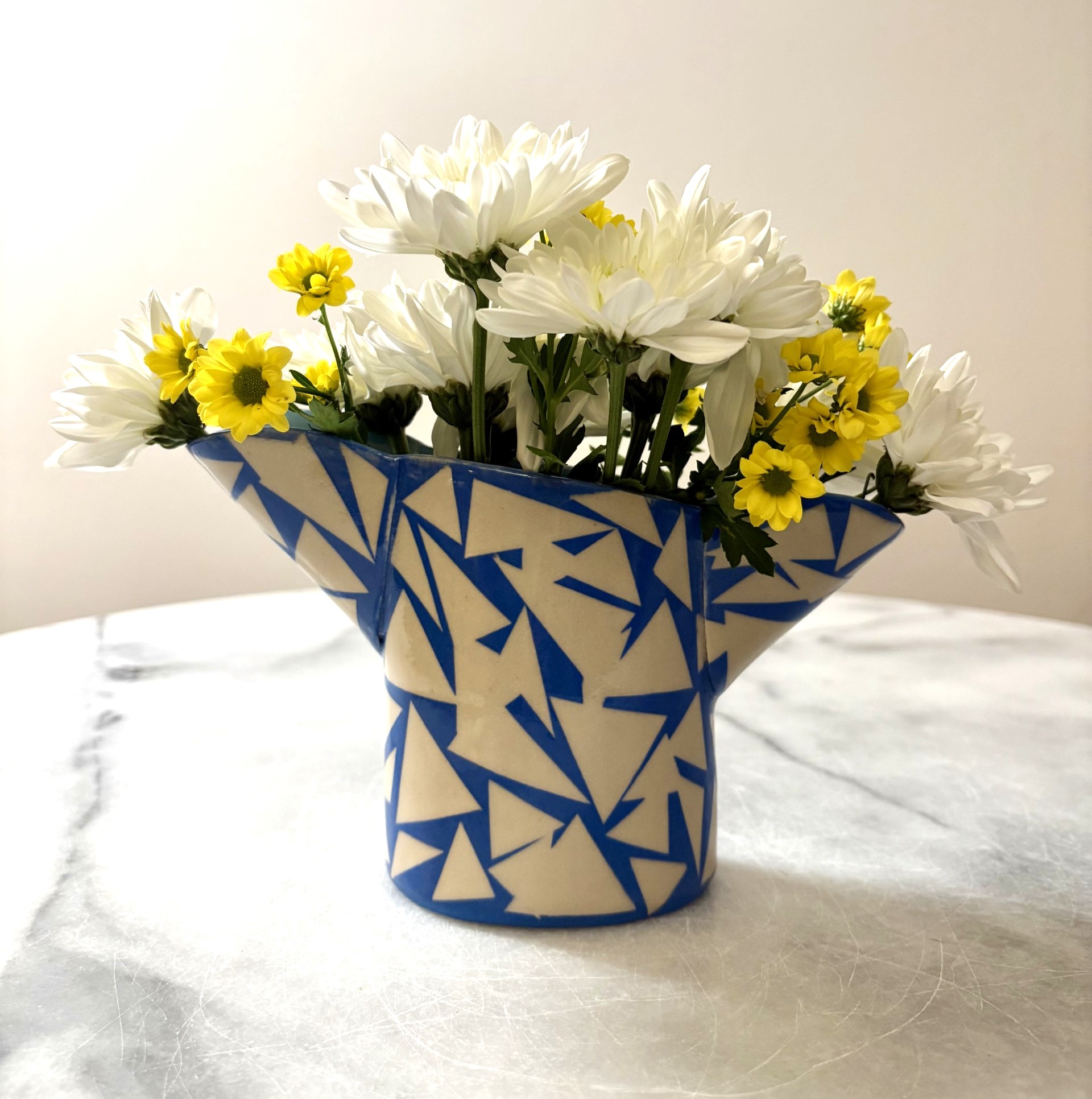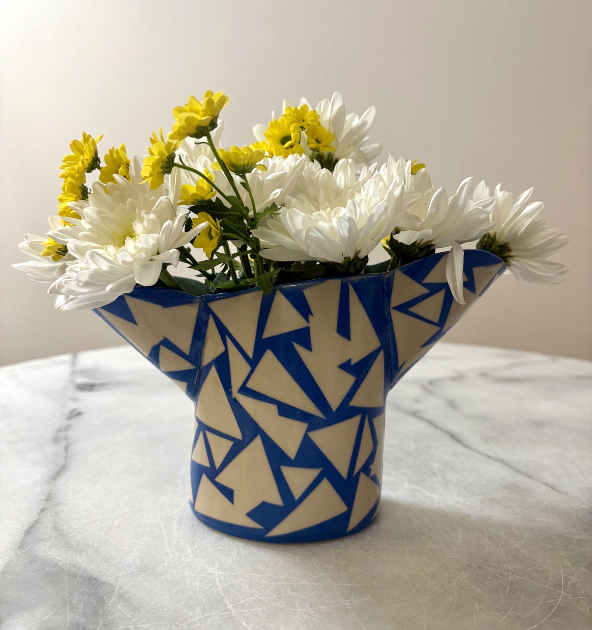 SHC123 -Small double spouted vase -cobalt with pale blue interior 12cm tall x 11cm wide
