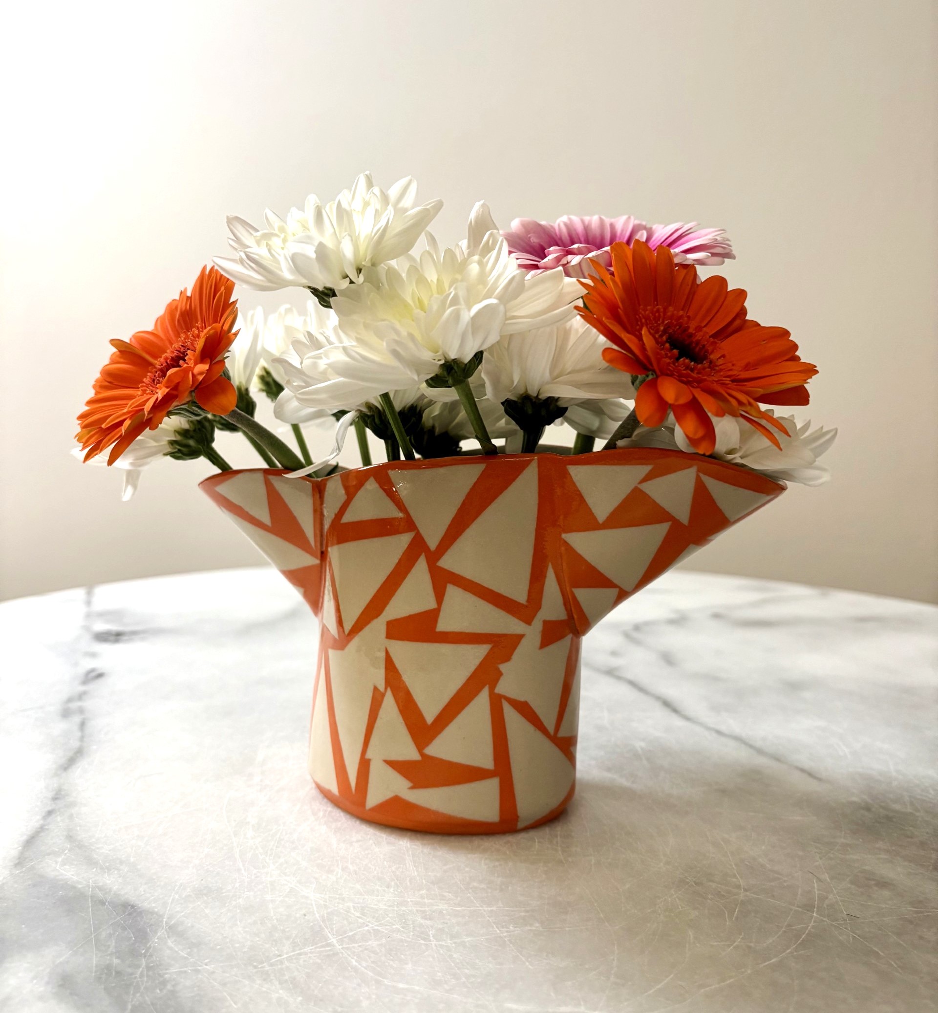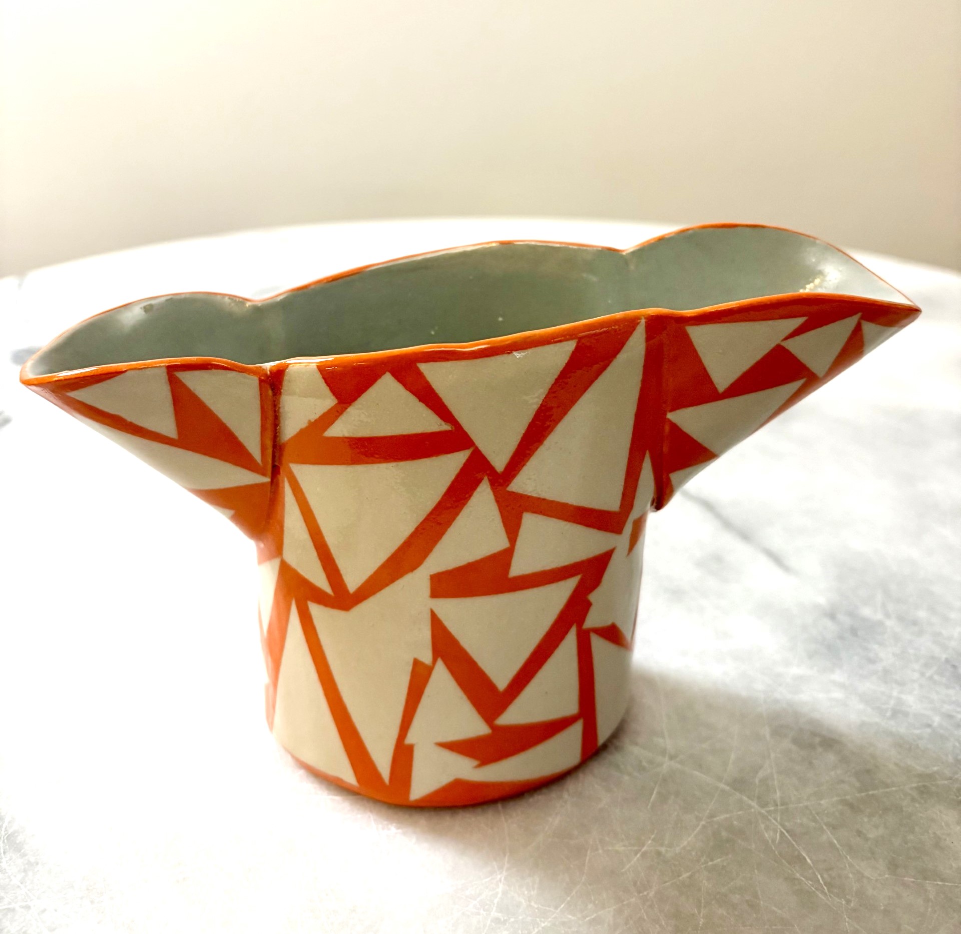 SHC128 -Small double spouted vase- Orange with dove grey interior 12cm tall x 11cm wide