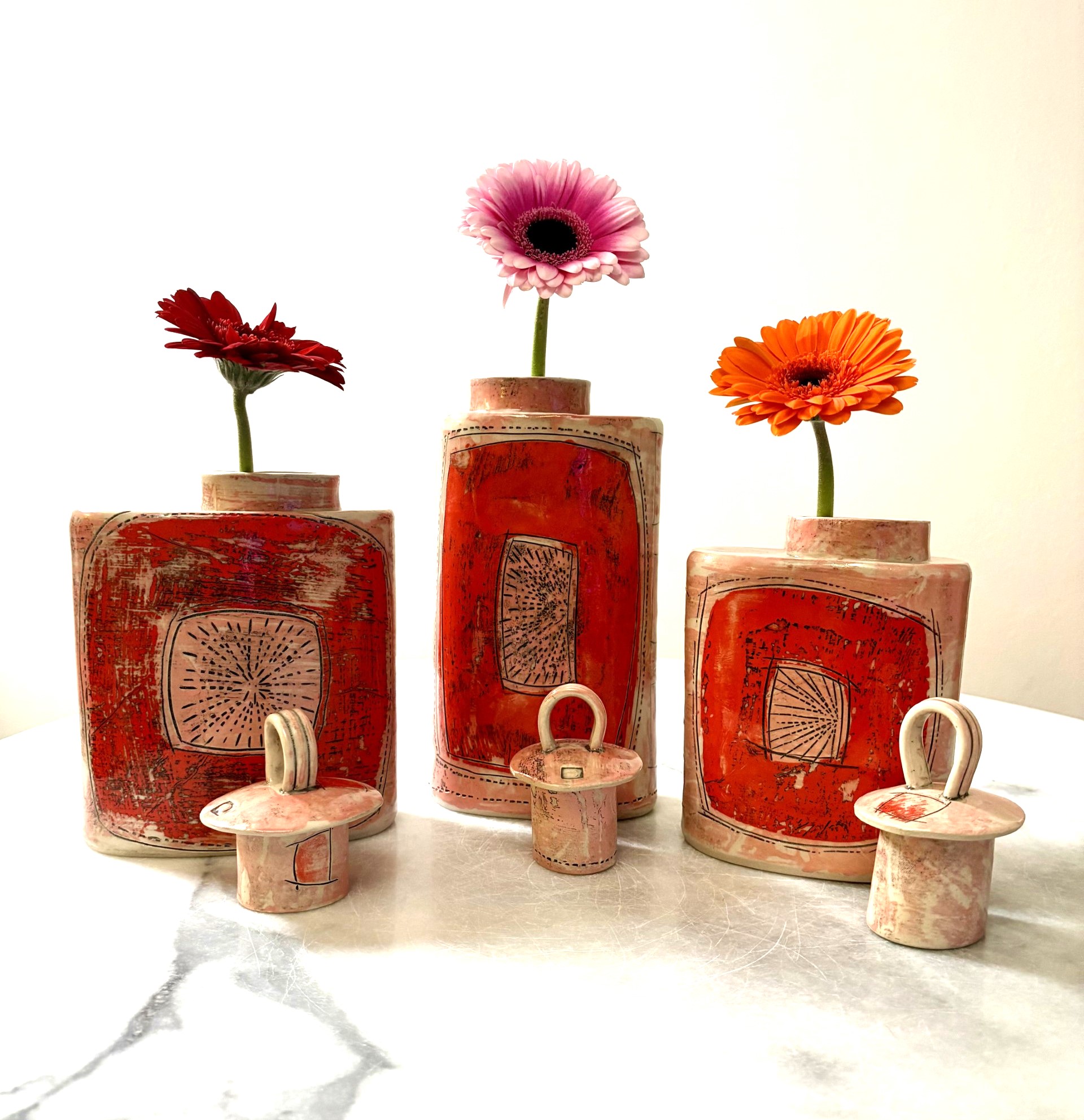 SHC133 Small Red flower flask -13cm tall x 12cm wide