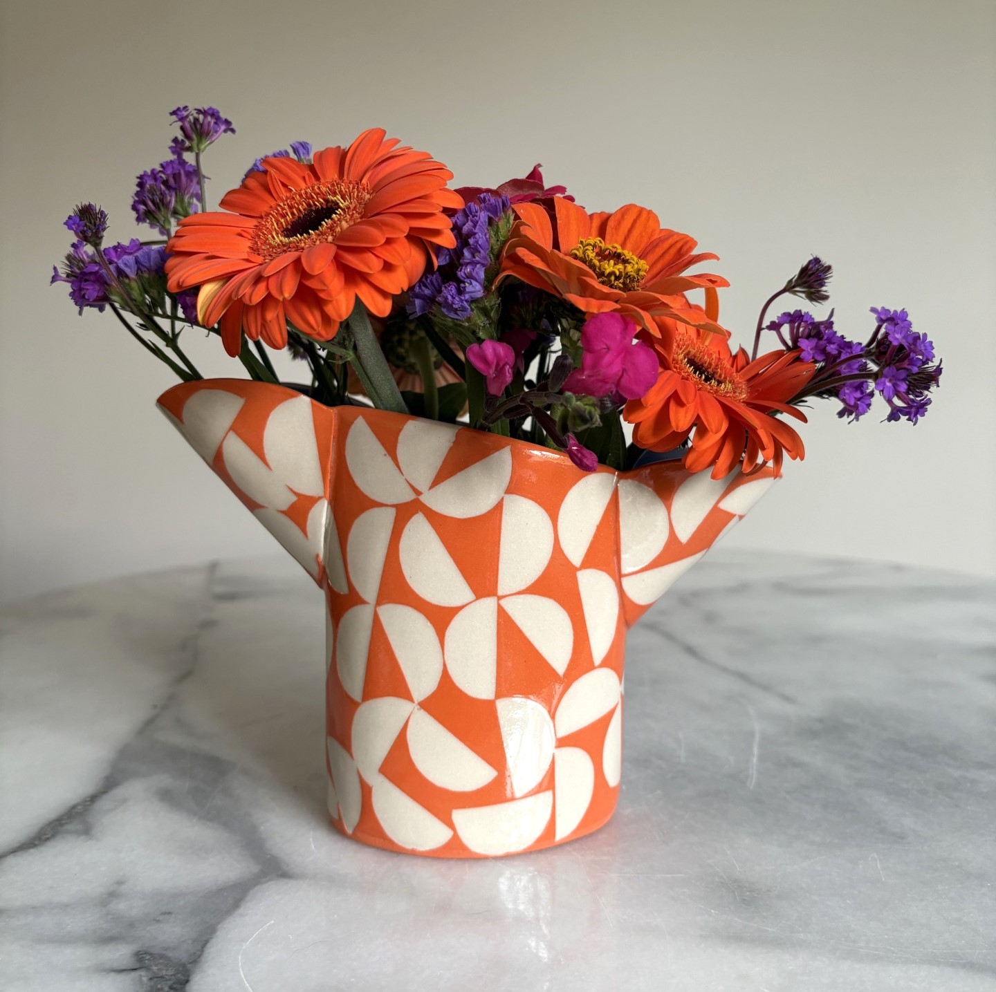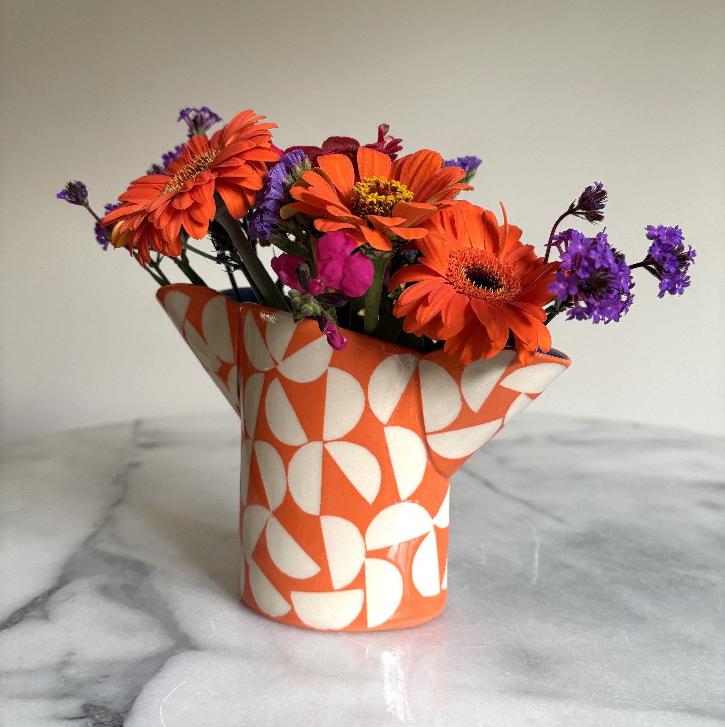 SHC96 – Small Double Spouted Vase – Orange Moon with cobalt interior 12cm tall x 11cm wide
